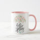 Pretty seasonal mug has a colorful floral umbrella with "Hello Spring" text in modern script