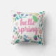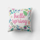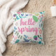 Hello spring pillow for spring decorating. Floral elements in spring colors surround a center that reads HELLO SPRING in a fun script.