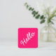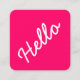 A square hello style profile card template with a simple clean design. A solid color on the front with "Hello" written in a stylish font placed at 45 degrees. Name, profession/job title along with telephone, email and website address on the reverse side. The name also has an underline in a matching colour to that used on the front, this can also be shortened or lengthened. This template is also a good starting point for further customization.
