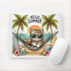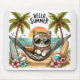 A cute tropical summer illustration featuring an adorable cat relaxing in a hammock between two palm trees. The cat wears stylish sunglasses and a flower garland while enjoying a coconut drink. The vibrant beach scene includes a sunset, surfboards, sailboats, a beach ball, and colorful tropical flowers. Perfect for summer-themed prints, t-shirts, posters, and fun seasonal merchandise.