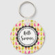 A keychain with an image of a summertime pattern of popsicles and ice cream in watercolors. Hello Summer written in a fun trendy font inside a round whimsical frame.