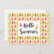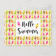 A postcard with an image of a summertime pattern of popsicles and ice cream in watercolors. Hello Summer written in a fun trendy font.