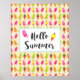 A poster with an image of a summertime pattern of popsicles and ice cream in watercolors. Hello Summer written in a fun trendy font.