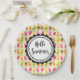 Paper plates with an image of a summertime pattern of popsicles and ice cream in watercolors. Hello Summer written in a fun trendy font inside a round whimsical frame.