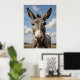 A warm and expressive portrait of a curious donkey set against a blue sky, evoking charm and tranquility in a rural setting.