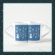 A Slice of Life and Delight presents Hello, Winter Wonderland coffee mug set with a snowman decorated with white snowflakes, pink writing, and a blue backdrop. The snowman coffee mug set also have a blue hat and scarf.