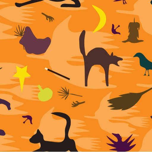 Fun, colorful, witch-themed pattern on bright halloween orange, with a witch, a broom, a moon, a strange bat, and of course more than one kitty cat.