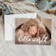 hello baby modern bold script photo new born baby birth announcement card with baby girl theme. The text and colors can be edited.