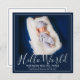 This design features a photo of the newborn with the text "Hello World" in modern popular typography with the baby's name, birth details and parents names below.