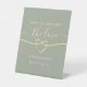 Elegant, minimalist, simple sage green wedding Help Us Capture The Love tabletop sign with gold rope heart and modern calligraphy script.