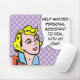 Talk about an honest "Help Wanted" ad! This mousepad design features a pretty comic book gal and a speech bubble with the words, "Help Wanted: Personal Assistant to deal with my crap!" The blue eyed blond is wearing a red and white polka dot shirt with a blue and white polka dot collar. Comic book gal and speech bubble are on a patterned, lavender background. Use this mousepad daily and wait for the applicants to beat a path to your door.