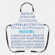 The main landmarks, parks and islands of Helsinki, the capital of Finland, and well-kept vacation destination secret. Typography in dark and blue as well as the blue and white of the Finnish flag. An apron to inspire Nordic recipes!