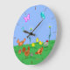 Hens and chicks running around the farmyard with butterflies and toadstools.