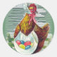 Cute dimensional mother hen with an apron full of colorfully dyed Easter eggs. She is standing in a barnyard with a cute Easter Bonnet on! Matching Easter card: