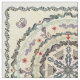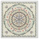 In soft hues of aqua and lavender with melon red accents over an ecru background, a circular mandala of natural shapes, flowers, and paisleys.