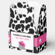 Celebrate brides to be with these disco cowgirl themed bachelorette party favor boxes. They feature a fun black and white cow print with an illustration of a disco ball wearing a pink cowboy hat. The text is ready to be customized with your own message.