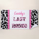 This custom beach towel is perfect for your disco cowgirl themed bachelorette party celebration with it's fun pink, black and white color scheme with black and white cow hide patterned graphics and pink and white star accents. Features the message "LAST RODEO" spelled out in cow patterned letters with the bride's name above in pink script writing.