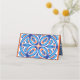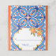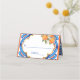She found her Main Squeeze bridal shower blue orange place cards, blue Majjolica Spanish Mediterranean tiles bunch of oranges with modern casual script, nice for summer outdoor functions place cards