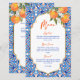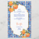 She found her Main Squeeze bridal shower blue orange menu card template, blue Majjolica Spanish Mediterranean tiles bunch of oranges with modern casual script, nice for summer outdoor functions personalized menu cards.