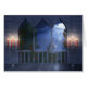 Standing on a candlelit balcony at night, looking out on red roses and a willow tree growing on the grassy bank of a lake. The bright rays of the silver moon stream through the window arches.