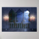 Standing on a candlelit balcony at night, looking out on red roses and a willow tree growing on the grassy bank of a lake. The bright rays of the silver moon stream through the window arches.