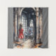 A young girl in a red dress stands in front of a rocking chair with a teddy bear in an ancient, cathedral-like room. A dove flies near the arched window, adding to the serene yet mysterious atmosphere.