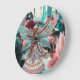 A beautifully intricate fairy with colorful, patterned wings stands in a whimsical, otherworldly landscape filled with fantastical plants and futuristic structures. Vibrant and ethereal, the scene exudes a dreamlike quality with its pastel hues and imaginative setting.