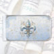 Blue and gold fleur de lis on blue cloud with golden stars.