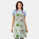 Herbs kitchen apron with place to personalize with name. Pretty pattern of herbs and and bees cover this long apron that comes in two adult lengths. Pink and green colors feature basil, thyme, yarrow and red clover. Little bumblebees fly around the beautiful fresh botanicals. The large herbal pattern has a layered appearance with text across the chest. Pink straps match the pretty clover images.