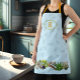 Long bib apron with herbs border at the bottom. Sweet little dragonflies cover the background which is pale blue. At the top, add a first name initial in gold color, inside a decorative panel. Straps match the gold letter. Makes a lovely gift for an herbalist or gardener.
