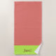 This beach towel design a wide bright green boarder with space for a name over a pale red shade. The design is inspired by Bluey's granny outfit from Bluey.