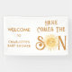 This cute boy's baby shower banner features the text "Here Comes The Son" in brown retro typography with a smiling yellow watercolor sun. Easily customizable. Original Watercolor © MicheleDavies.