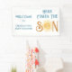 This cute boy's baby shower banner features the text "Here Comes The Son" in blue retro typography with a smiling yellow watercolor sun. Easily customizable. Original Watercolor © Michele Davies.