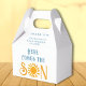 This cute sunshine-themed baby shower favor box features a watercolor illustration of a yellow sun and "Here comes the Son" in stylish retro blue typography. Perfect for a boy's baby shower.