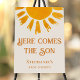 This cute baby shower sign is decorated with a yellow watercolor sun and says "Here Comes The Son" in stylish retro typography on a soft cream background.