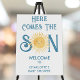 This cute boy's baby shower welcome sign features the text "Here Comes The Son" in blue retro typography with a smiling yellow watercolor sun. Easily customizable. Original Watercolor © Michele Davies.