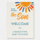 This sun-themed baby shower welcome sign is decorated with a colorful sun and stylish typography on a cream background. The text is customizable. Original Watercolor © Michele Davies.