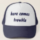 Navy blue and white hat with the words "here comes trouble". This hat is dedicated to my little brother; it fits him to the T!!!