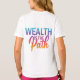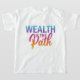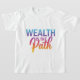 The t-shirt features the phrase "Wealth is the Path" in a vibrant multicolor gradient. Each word smoothly transitions into the next, creating a dynamic and eye-catching design.