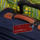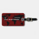 Graphic map of the world on a dark-red background, with the image of a small airplane, personalized with the name and initials of the stylish traveler, and with editable slogan "here we go again" (handwritten font-style)... to easily identify your baggage and travel in style...