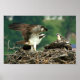 The final frame in a second landing series with the adult osprey bringing a branch back to the nest full of chicks.