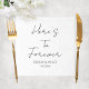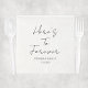 White elegant and clean wedding napkins with the quote "here's to forever" in script calligraphy, the couple's names, and the date. All text is editable and can be personalized with a psalm, poem, or any message you'd like to add for this special occasion.