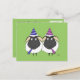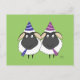 Post Card showing two adorable sheep in party hats with horns. Caption on the back of the postcard reads, "Here's Two Ewe Congratulations!". Background is displayed as a green color, but it and the font and phrase can easily be customized to whatever you'd like.