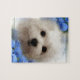 This product features Hermes, a sweet little Maltese Dog. His portrait is contained in a mirrored frame surrounded by pretty Bluebells.