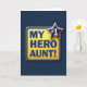 This card features a rounded rectangular badge centered on a deep navy background, giving it the look of a special award meant for someone you adore ❤️. The badge face is bright yellow, like a warm spotlight, and it’s edged with a glossy medium-blue border that feels crisp and polished. In the middle, the message “MY HERO AUNT!” appears in chunky, raised-looking capital letters in deep blue, with tiny highlights that make the lettering seem enamel-like. The text sits centered and evenly spaced, creating a steady, confident feel, like a proud shout of affection from someone close. A five-point star overlaps the upper-right corner of the badge in matching blue, trimmed in golden yellow as if it’s been carefully outlined for extra shine 🌼. Inside the star, “#1” is placed prominently in a warm golden tone, standing out clearly against the blue. Soft shadowing under the badge border and letters adds depth, while the navy background stays smooth and solid behind the bright yellow plaque and the corner star.