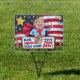 A vibrant yard sign features a superhero-themed character promoting voter participation for the upcoming election, set against a patriotic backdrop.