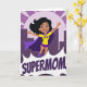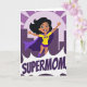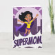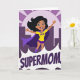 Designed with a comic-style illustration, this Mother’s Day card features an animated woman soaring mid-air with arms stretched wide, her bright smile and open posture suggesting a warm, affectionate embrace ❤️. Her dark hair streams behind her as she wears a sunny yellow top with “MOM” across the chest, paired with purple shorts, matching boots, and a flowing purple cape. The background shows layered city silhouettes in soft lavender tones, giving the scene an upbeat urban backdrop. Behind her, a half-circle burst of radiating lines in purple shades frames her like a spotlight and adds motion. Near the lower area, a jagged speech bubble holds the word “SUPERMOM!” in thick purple lettering, making the message pop. The strong contrast between yellow and purple keeps the focus on her heroic look while still feeling friendly and caring 🌼. The skyline sits in the distance as stacked lavender shapes, with the radiating arc centered behind her cape.