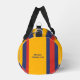 Three-color design with big hero stripe and smaller side stripes. Clean lines in three colors for your gym bag. Add your name on the front and a motivational quote or additional text on the side. This variant is the retro solid blue, yellow and red version.