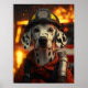 A brave Dalmatian dog dressed as a firefighter, standing in front of a burning scene with sparks flying. The dog wears a fire helmet and protective gear, symbolizing courage and heroism.