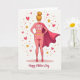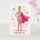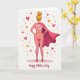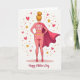 This card shows a heroic woman seen from behind, standing with hands on hips like she’s ready to protect someone she loves ❤️. She wears a rosy pink, fitted outfit patterned with small golden hearts, and her posture suggests a steady, caring confidence. A rich fuchsia cape pours down her back in a sweeping curve, adding motion and a touch of drama to the scene. Her blonde hair is gathered into a high bun, and small gold drop earrings catch the light. The background stays bright white so the warm pinks, reds, and golds stand out, while red hearts, gold stars, and tiny ochre dots float around her like affectionate sparks 🌼. Across her upper back and shoulders, a short message praising a special mother figure appears in chunky white letters with yellow accents, and a second line of greeting sits lower in a flowing, cursive-style font. The figure is grounded by a soft pink oval beneath her feet, with scattered hearts and stars drifting outward around the cape.